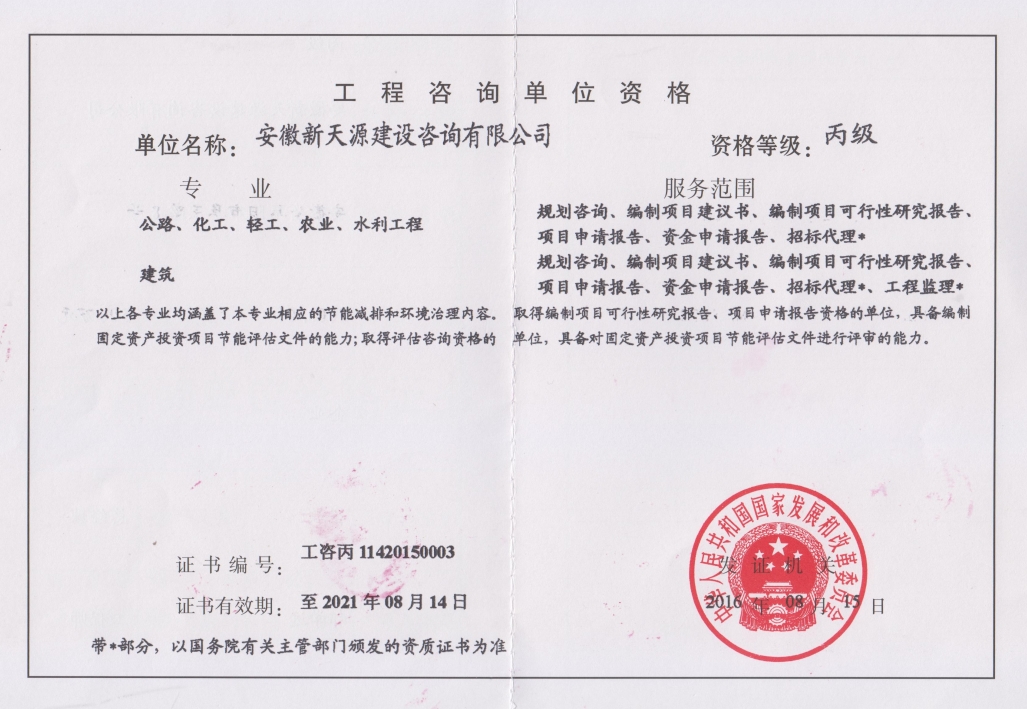 安徽新天源建設咨詢有限公司是一家全過程項目管理咨詢機構,重點開展PPP項目咨詢、BIM項目咨詢、招標代理、工程造價、工程監理、工程咨詢等業務。 公司成立于2003年4月10日,為股份制企業,現注冊資金5000萬元,辦公面積2200多平方米,法人代表崔敏。在成立同年,公司取得了國家發展改革委員會頒發工程咨詢資格證書,并成為安徽省工程咨詢協會會員單位。隨著近年來的不斷發展壯大,公司相繼取得了招標代理資質證書(工程招標代理資質資格證書、政府采購代理資格證書、水利工程招標代理資格證書、中央投資項目招標代理資質證書)。 2008年11月取得工程造價資質證書并成為阜陽市審計局審計協審定點單位; 2012年3月取得安徽省發改委固定資產節能評估資質證書; 2012年3月取得安徽省國土資源廳測繪資質證書; 2012年7月獲得安徽省經濟和信息化委員會第一批工業投資項目節能評估機構備案; 2012年9月取得水利工程監理資質證書; 2014年1月取得工程監理資質證書;現工程招標代理及工程造價已取得甲級資質,并開展了環境影響評價、工程測量、房地產評估等業務。